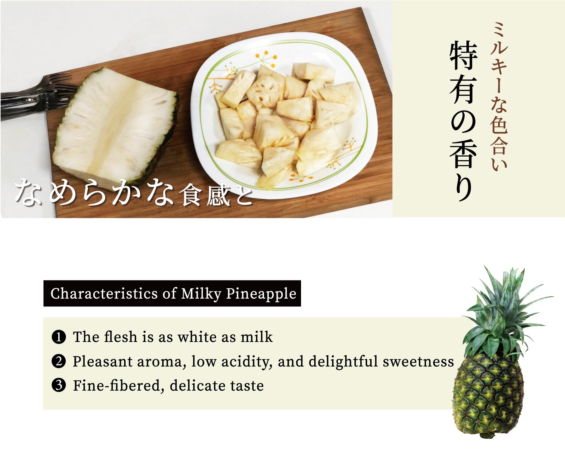 Its flesh color is white, has a unique aroma, and is extremely sweet, so it is named Milky Pineapple. It has less fiber and is sweet and juicy. It was once one of the designated fruits for the Olympic representative of Taiwan.